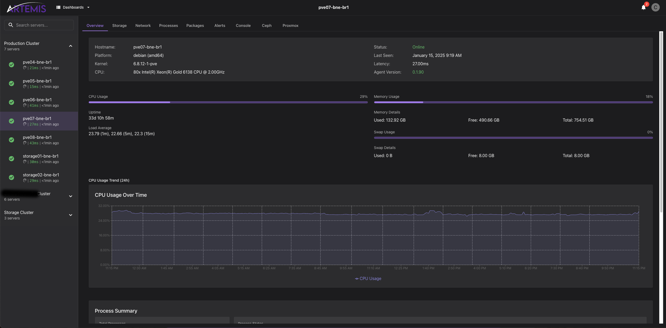 Artemis provides Enterprise-Grade Server Monitoring with real-time metrics, process management, and package updates.