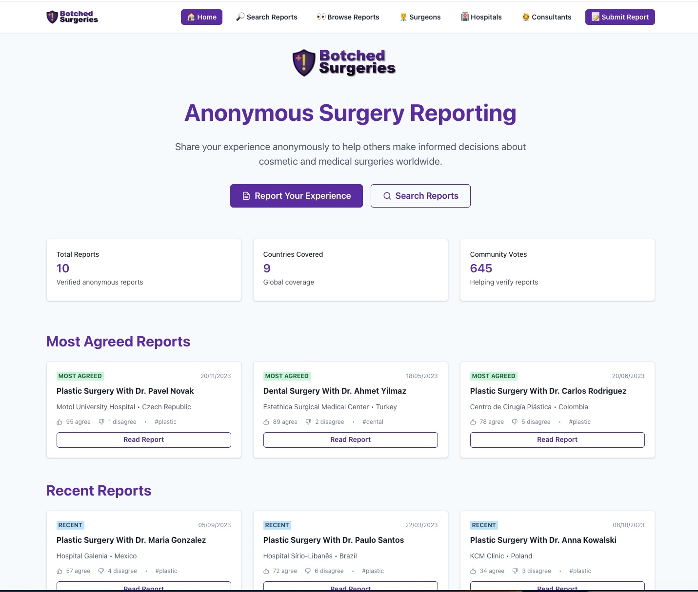Botched Surgery Reports is an anonymous platform designed for individuals to report their experiences related to botched surgeries and medical tourism. This service aims to provide a space where users can share their stories, thereby helping others to make informed decisions regarding their medical procedures and travel for healthcare. By facilitating these reports, the platform seeks to raise awareness about the potential risks associated with medical tourism and the importance of thorough research before undergoing surgery abroad. The emphasis on anonymity ensures that users can share their experiences without fear of repercussions, fostering a supportive community for those affected by such unfortunate medical incidents.